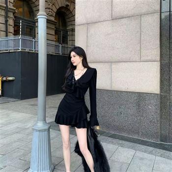 YF4498-图片色春秋新款V领套头微喇叭长袖荷叶边下摆欲女风气质连衣裙