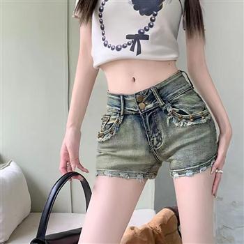 YF4522-图片色港式系扣高腰破洞流苏洗水宽松大码A字设计感夏季牛仔短裤