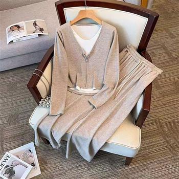 YF4503-(3色入内)甜美时尚长袖拉链短款上衣搭松紧腰坠地裤休闲套装