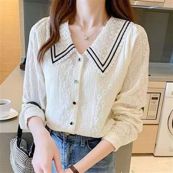 YF4504-图片色甜美小清风长袖娃娃领撞色设计系扣大码显瘦优雅蕾丝衫