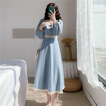 YF4505-图片色复古气质泡泡袖花边拼接方领包扣中长款新款连衣裙