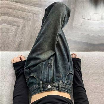 YF4507-图片色韩版东大门热销水泥灰复古气质宽松阔腿坠地感牛仔裤