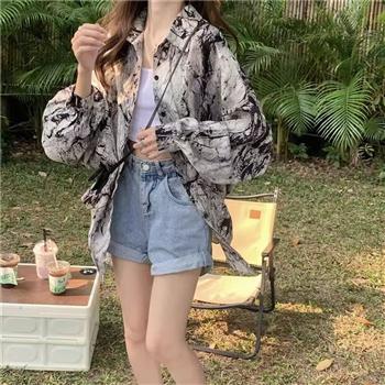 YF4499-图片色港味泼墨扎染胖MM显瘦加大码长袖翻领春夏百搭上衣