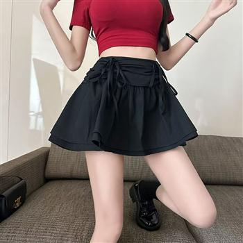 YF4512-(2色入内)甜美时尚蝴蝶结绑绳收腹高腰褶折短裙 白色简法防走光半身裙