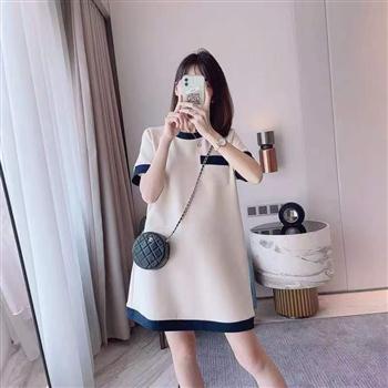 YF4511-图片色慵懒风加大码藏肉显瘦圆领套头短袖二色拼接A字T恤裙