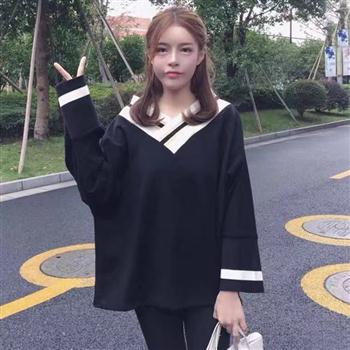YF4514-图片色慵懒风黑白拼接交叉领加大码显瘦韩版新款卫衣潮上衣