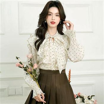 YF4516-图片色甜美时尚泡泯然袖荷叶边系蝴蝶结珍珠扣波点雪纺衫