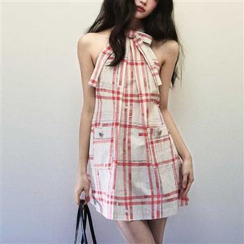 YF4515-图片色欲女风无袖围脖系蝴蝶结格子A字裙 时髦设计夏季连衣裙