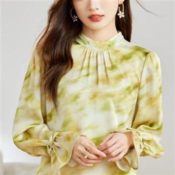 YF4508-(3色入内)时尚春装木耳边立领褶折碎花扎染个性洋气大码上衣