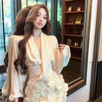 YF4419-图片色时尚新款灯笼袖V领褶折束腰设计感洋气上衣