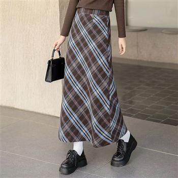YF4421-图片色韩版冬季复古格子裙 收腹高腰蓝色格子纹开叉一步裙