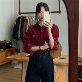 YF4422-(3色入内)甜美时尚秋冬灯芯绒长袖系扣刺绣口袋大码复古衬衫上衣