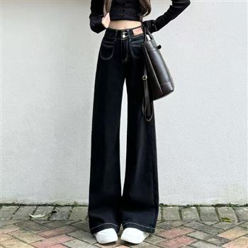 YF4423-图片色港味双排扣高腰直筒显瘦拖地牛仔裤 黑色大码休闲裤
