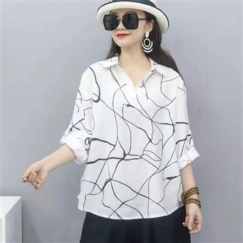 YF4426-(3色入内)胖MM显瘦大码不规则线条印花长袖V领宽松显瘦衬衫上衣