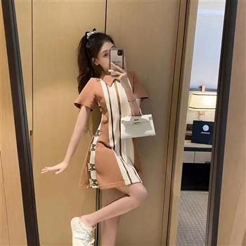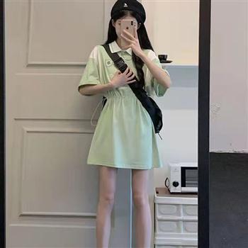 YF4428-(2色入内)小可爱二色拼接POLO领字母印花抽绳束腰短款潮牌连衣裙