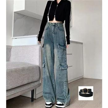 YF4429-图片色新款韩版高腰工装多口袋拼接坠地感慵懒风大码阔腿拖地牛仔裤