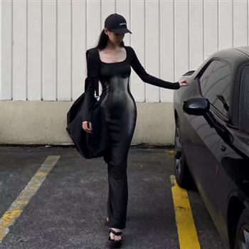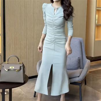 YF4432-(3色入内)复古气魄长袖套头褶折镂空开叉一步裙 宴会名媛气质鱼尾裙