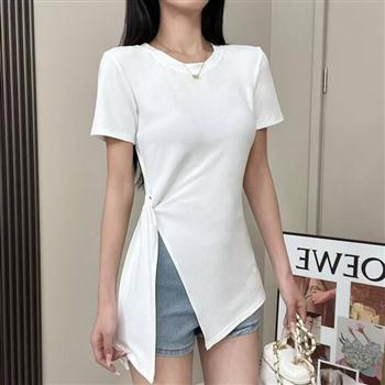 YF4437-(3色入内)时尚小众设计扭纹开叉圆领短款2025韩版收腰上衣
