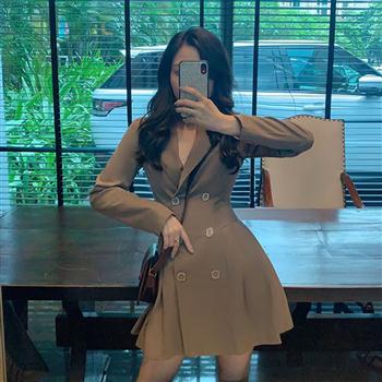 YF4439-(2色入内)甜美时尚双排扣修腰褶折设计长袖西装领大码显瘦连衣裙