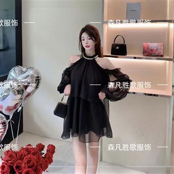 YF4440-(2色入内)欲女风镂空露肩长袖珍珠挂脖显瘦温柔风大码雪纺连衣裙