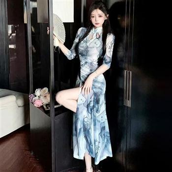 YF4442-图片色优雅复古气质扎染开叉显瘦收腰镂空设计大码连衣裙