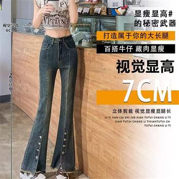 YF4443-(2色入内)春秋港式新款系扣高腰微喇叭开叉排扣设计花边牛仔裤