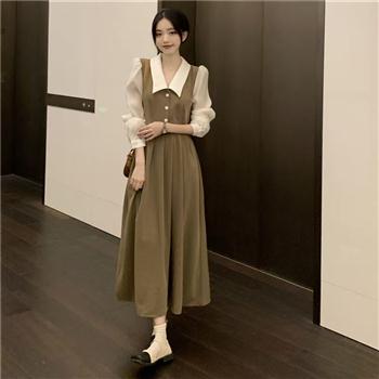 YF4445-(2色入内)法式白色长袖拼接翻领排扣装饰设计感长款复古连衣裙