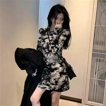 YF4446-图片色时尚紧身圆领套头扎染包臀长袖显瘦辣妹设计感春秋连衣裙
