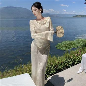 YF4447-图片色轻奢别致长袖套头后背绑绳V领系腰包臀优雅坠地感连衣裙