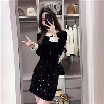 YF4451-图片色名媛时尚花边长袖围脖设计上衣搭亮片别致短款两件套装