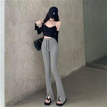 YF4441-(2色入内)春夏新款慵懒风抽绳微喇叭开叉设计坠地感条纹显瘦休闲裤