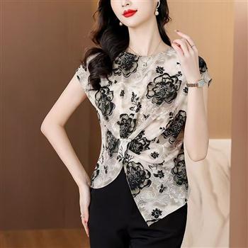 YF4452-图片色新款夏季玫瑰花提花不规则开叉套头设计感洋气个性上衣