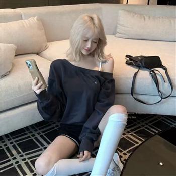 YF4453-图片色慵懒风露肩长袖套头胖MM显瘦加大码休闲卫衣潮 2025新款上衣
