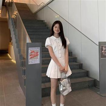YF4454-甜美时尚短袖POLO领系扣花边提花褶折防走光内衬夏季显瘦连衣裙