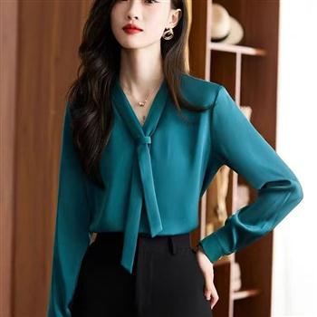 YF4458-(3色入内)甜美时尚设计长袖穿洞飘带设计宽松大码优雅气质雪纺衫