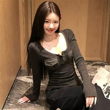 YF4457-(2色入内)新款长袖套头拉链口袋设计弹力紧身小可爱复古显瘦上衣