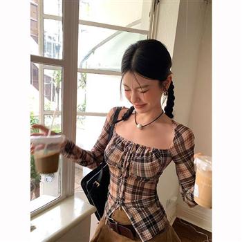 YF4154-图片色春装新款方领绑绳褶折开叉显瘦长袖格子衫 别致小众上衣