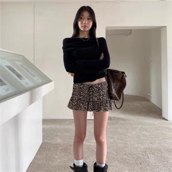 YF4141-(3色入内)泡泡袖套头豹纹围巾穿洞设计宽松大码露肩针织毛衣