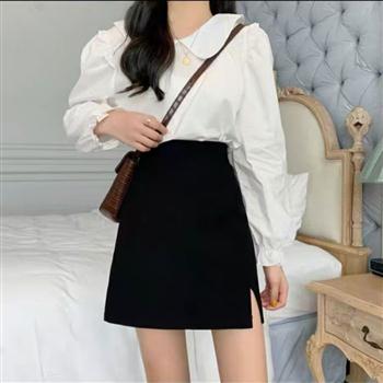 YF4155-(2色入内)优雅OL高腰A字开叉包臀纯色毛呢短裙 防走光简约半身裙