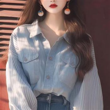 YF4157-图片色春秋新款条纹拼接牛仔慵懒风胖MM显瘦大码简约气质上衣