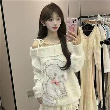 YF4158-图片色性感时尚一字肩小可爱狗狗刺绣长袖套头宽松针织上衣