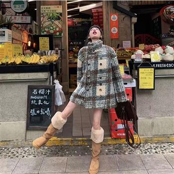 YF4161-图片色秋冬复古格子长袖立领排扣加厚毛呢大衣 时尚休闲气质上衣