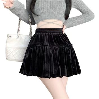 YF4151-图片色甜美小可爱收腰A字百褶金丝绒秋冬保暖别致防走光短裙