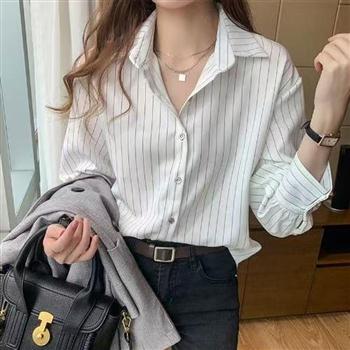 YF4165-(2色入内)韩版春秋百搭双纽扣长袖翻领条纹显瘦宽松大码别致衬衫
