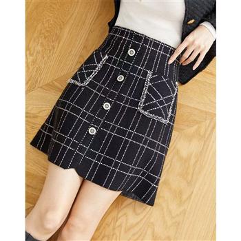 YF4168-图片色冬季小香风粗花毛呢排扣A字弧边设计甜美显瘦半身裙