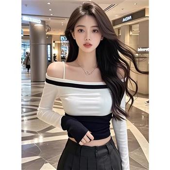 YF4163-图片色欲女风吊带黑白设计弹力收腹短款长袖显瘦小衫上衣