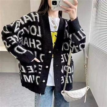 YF4177-(2色入内)东大门韩版字母提花慵懒风加大码长袖V领系扣针织上衣
