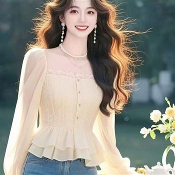 YF4169-图片色早春甜美气质网纱拼接蕾丝勾边方领束腰荷叶边复古上衣