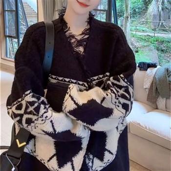 YF4170-图片色冬装不规则提花设计慵懒风长袖流苏宽松小众针织开衫外套
