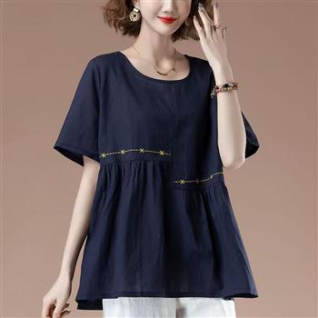 YF4142-图片色时尚不规则载剪拼接提花刺绣宽松大码圆领短袖上衣